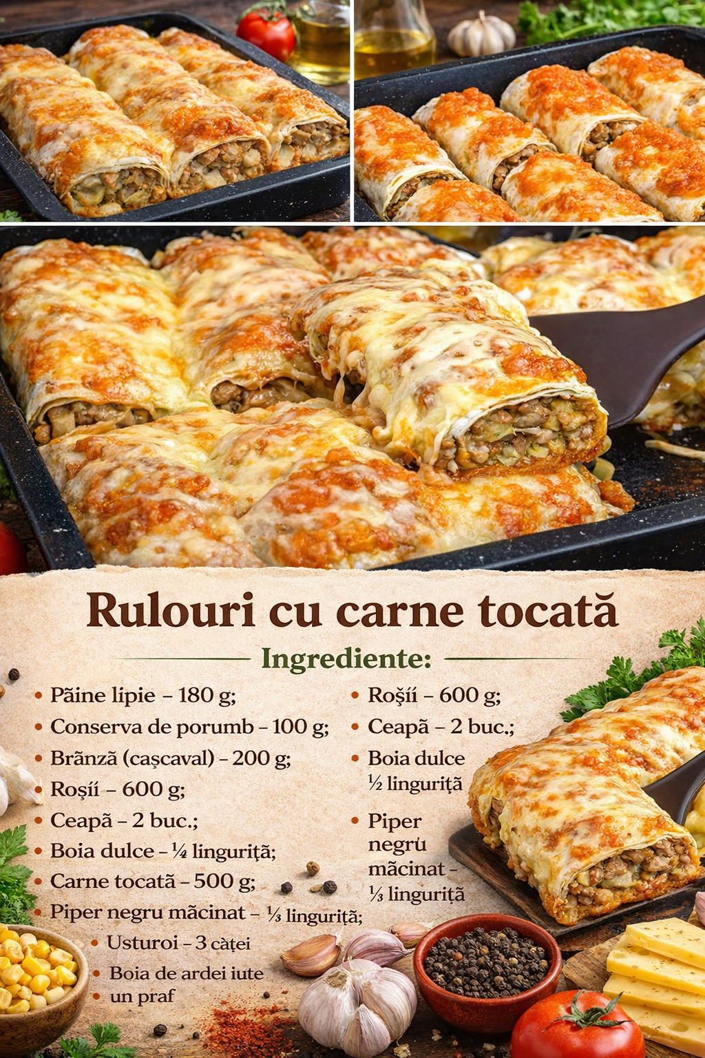 Puneti umplutura pe o parte a pitei, se presara cu branza rasa si se inveleste intr-un rulou.