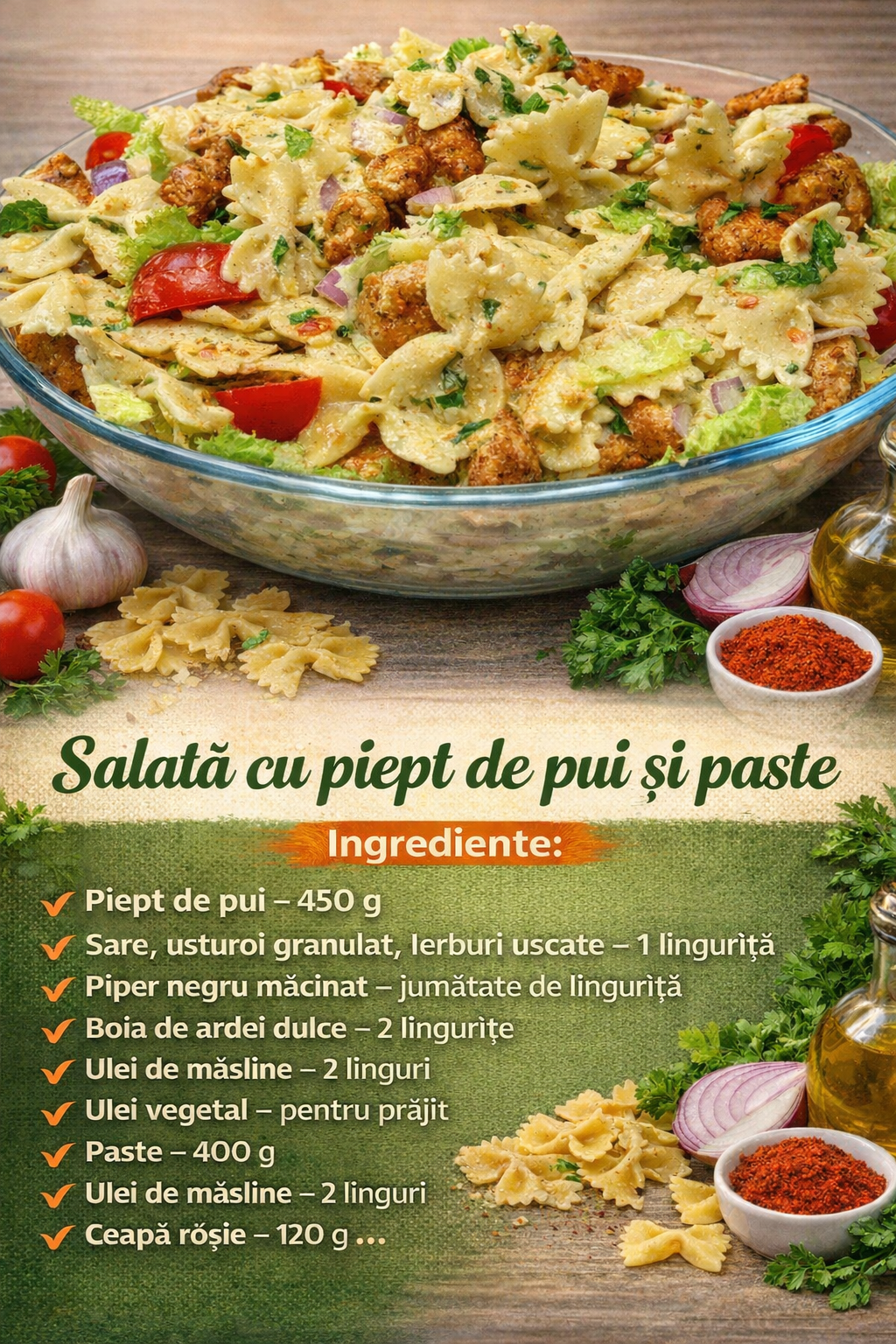 Salata cu piept de pui si paste- Foarte buna, mai ales ca se mananca rece, este perfecta pentru vara