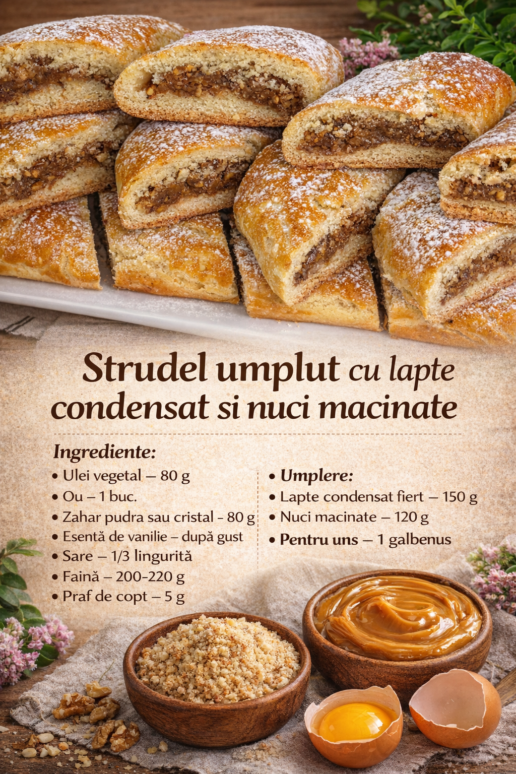 Strudel umplut cu lapte condensat si nuci macinate – Aluat fraged, aromat si foarte gustos