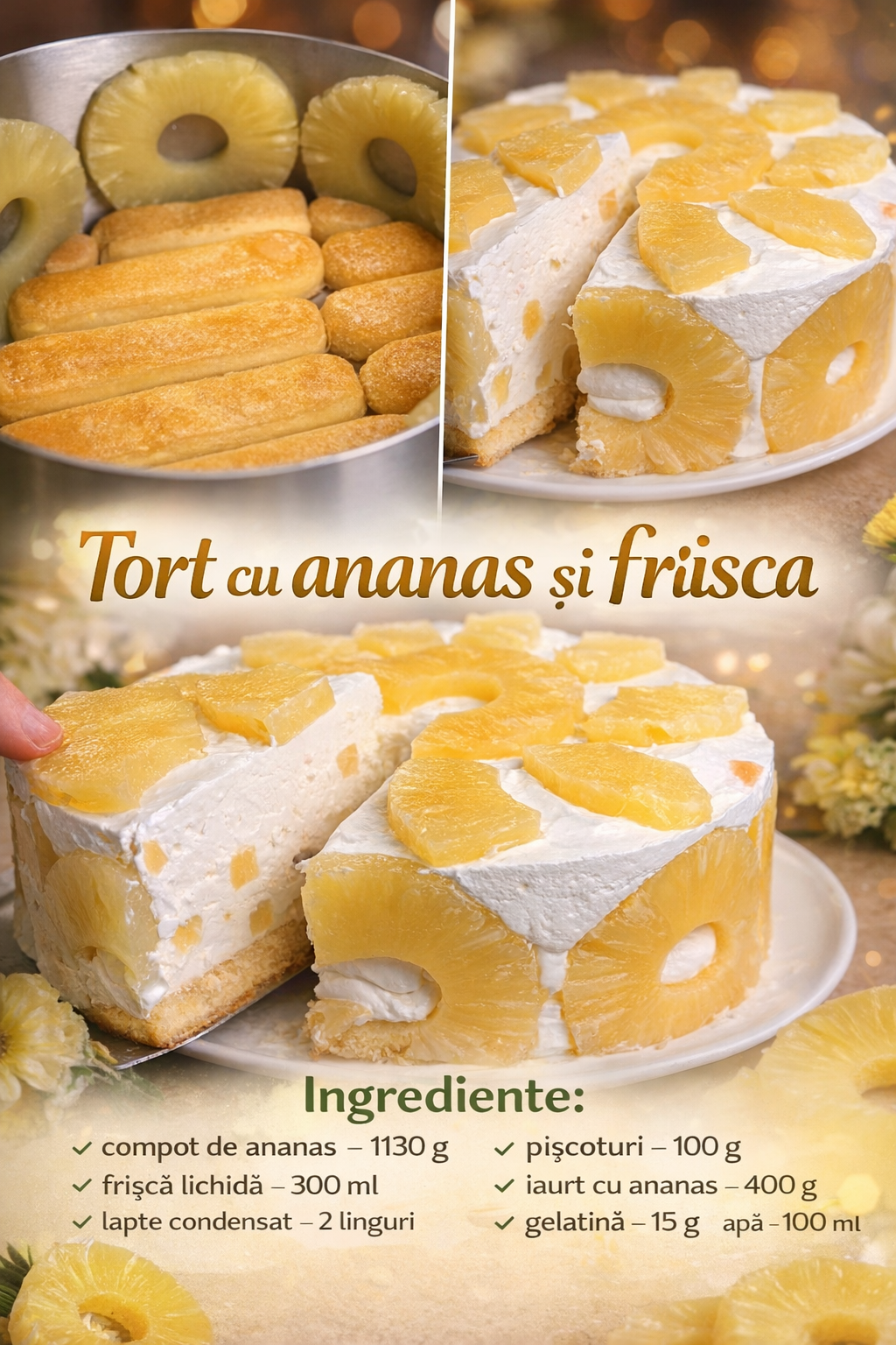 Inmuiati piscoturile in sucul de ananas si tapetati cu ele partea de jos a tavii.