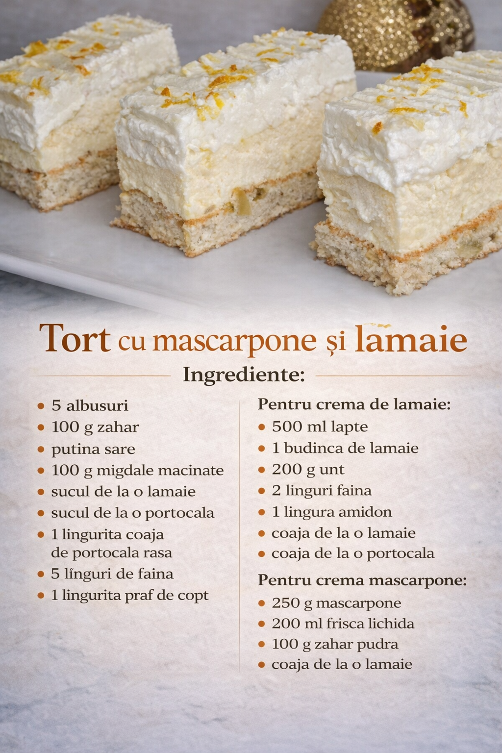 Bateti spuma frisca apoi amestecati zaharul si mascarpone, adaugati si coaja de lamaie.
