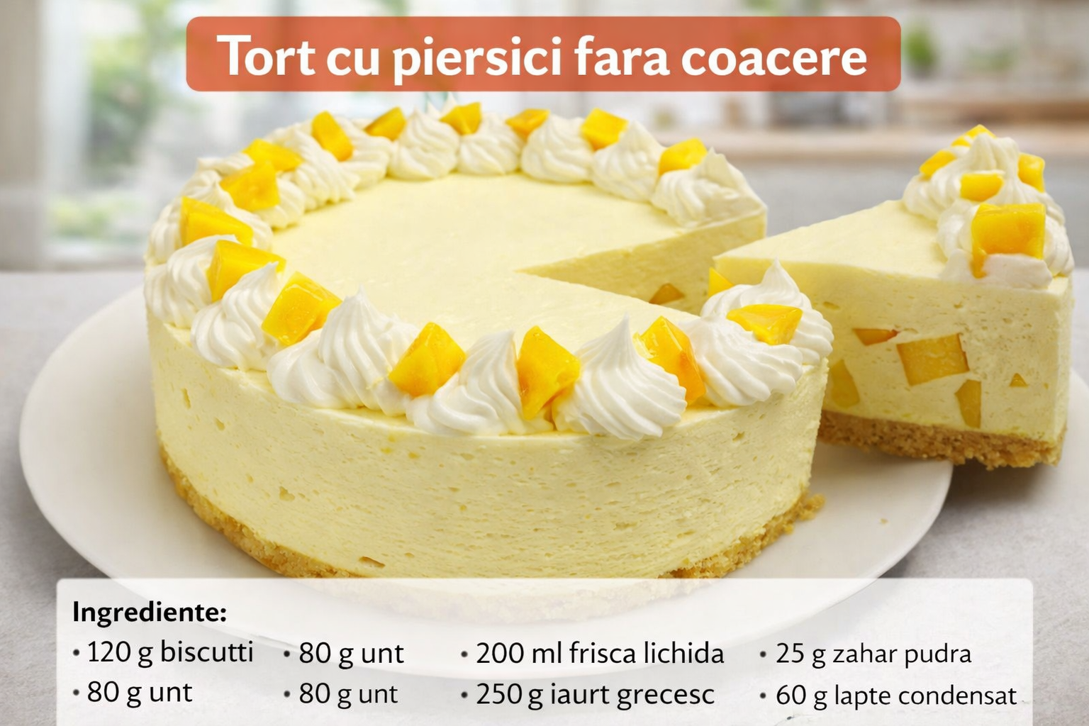 Ulterior, indepartam inelul tavii si hartia de copt si decoram tortul cu frisca (smantana pentru frisca mixata impreuna cu zaharul pudra) si cu feliute de piersici.