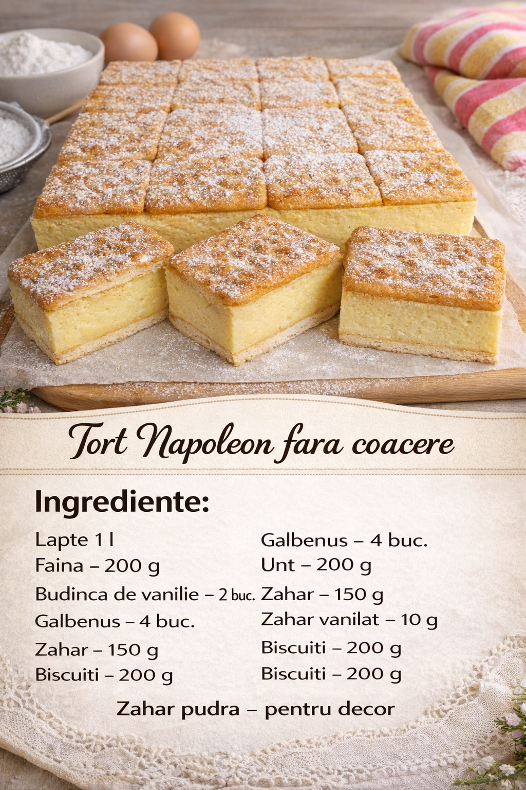 In ciuda absentei numeroaselor straturi inerente clasicului „Napoleon” , acest tort se va dovedi a fi destul de inalt si frumos. O reteta rapida si usoara care necesita doar sa faceti o crema. Datorita budincii de vanilie, se va dovedi atat densa, cat si frageda: cu o textura de sufle si o aroma de inghetata.